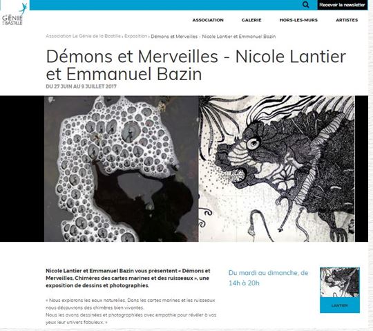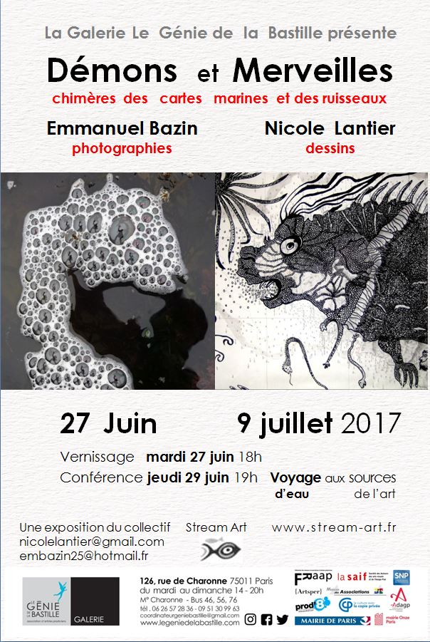 Nicole Lantier et Emmanuel Bazin exposent « Démons et Merveilles, Chimères des dessins sur cartes marines et des photos de ruisseaux » du 27 juin au 9 juillet :