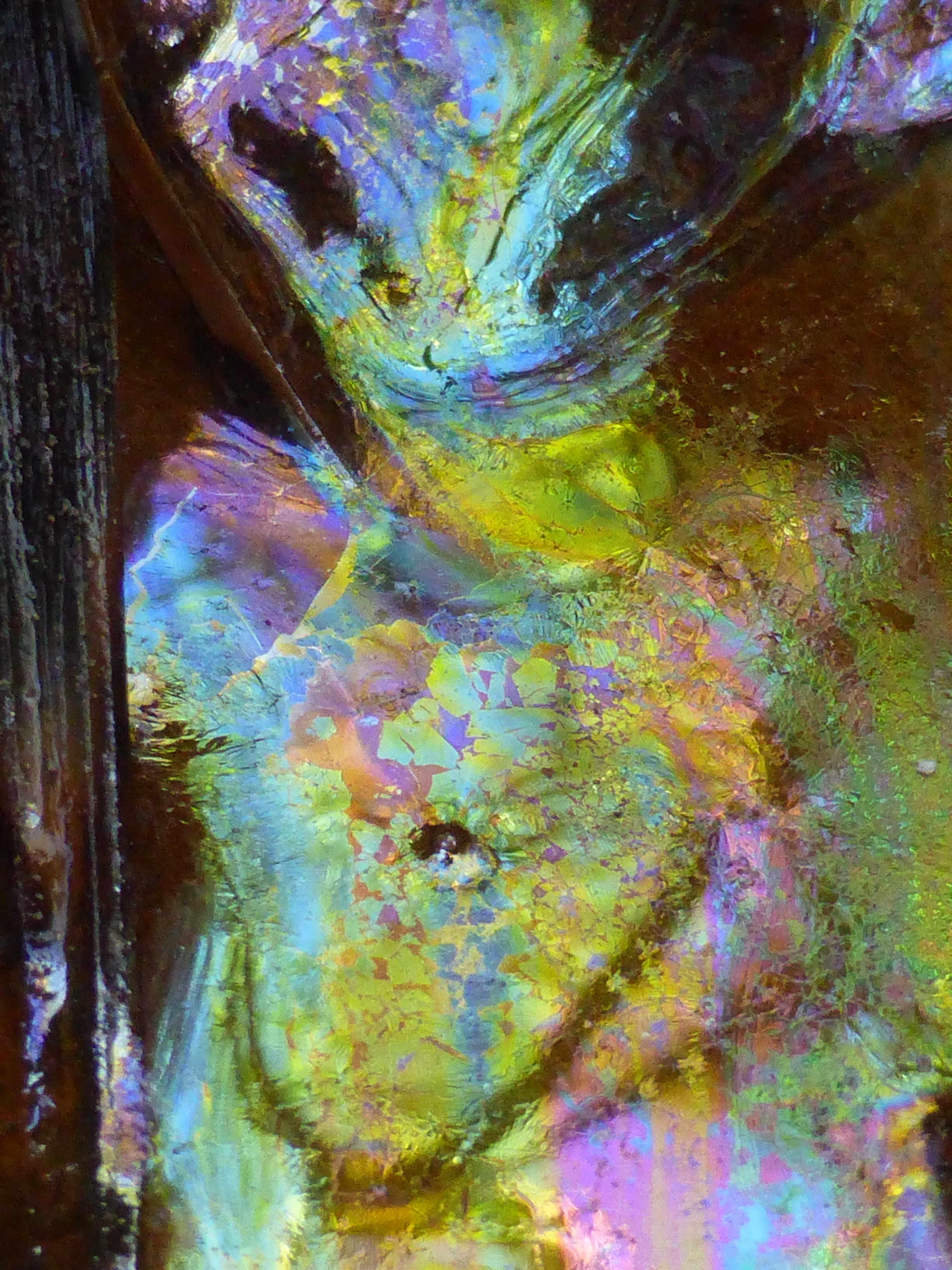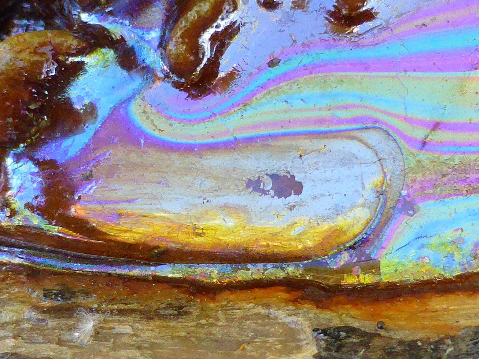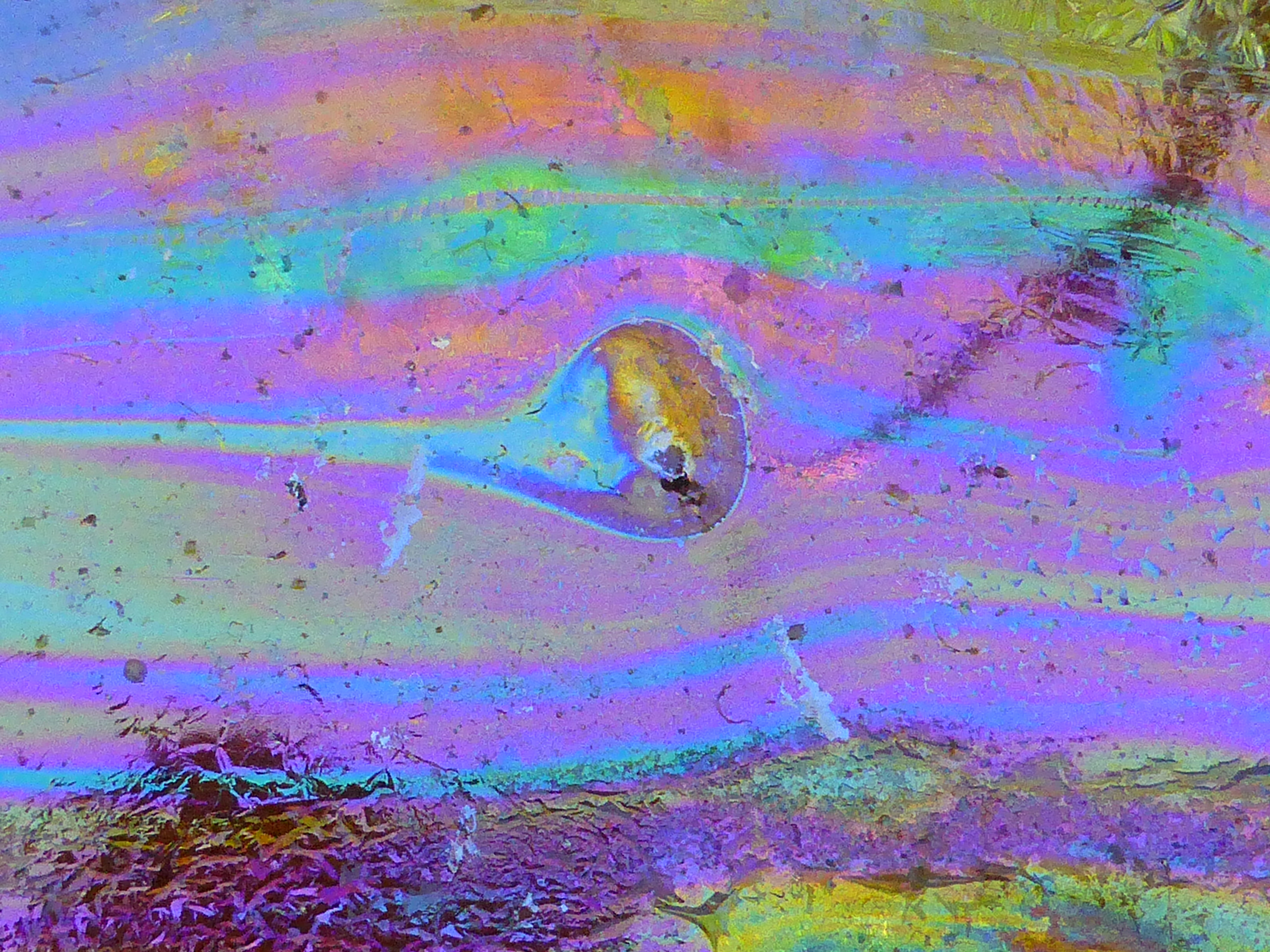 Un film mince d'hydrocarbures naturels dont l'épaisseur détermine la couleur ; leur vivacité éclate même à l'ombre.