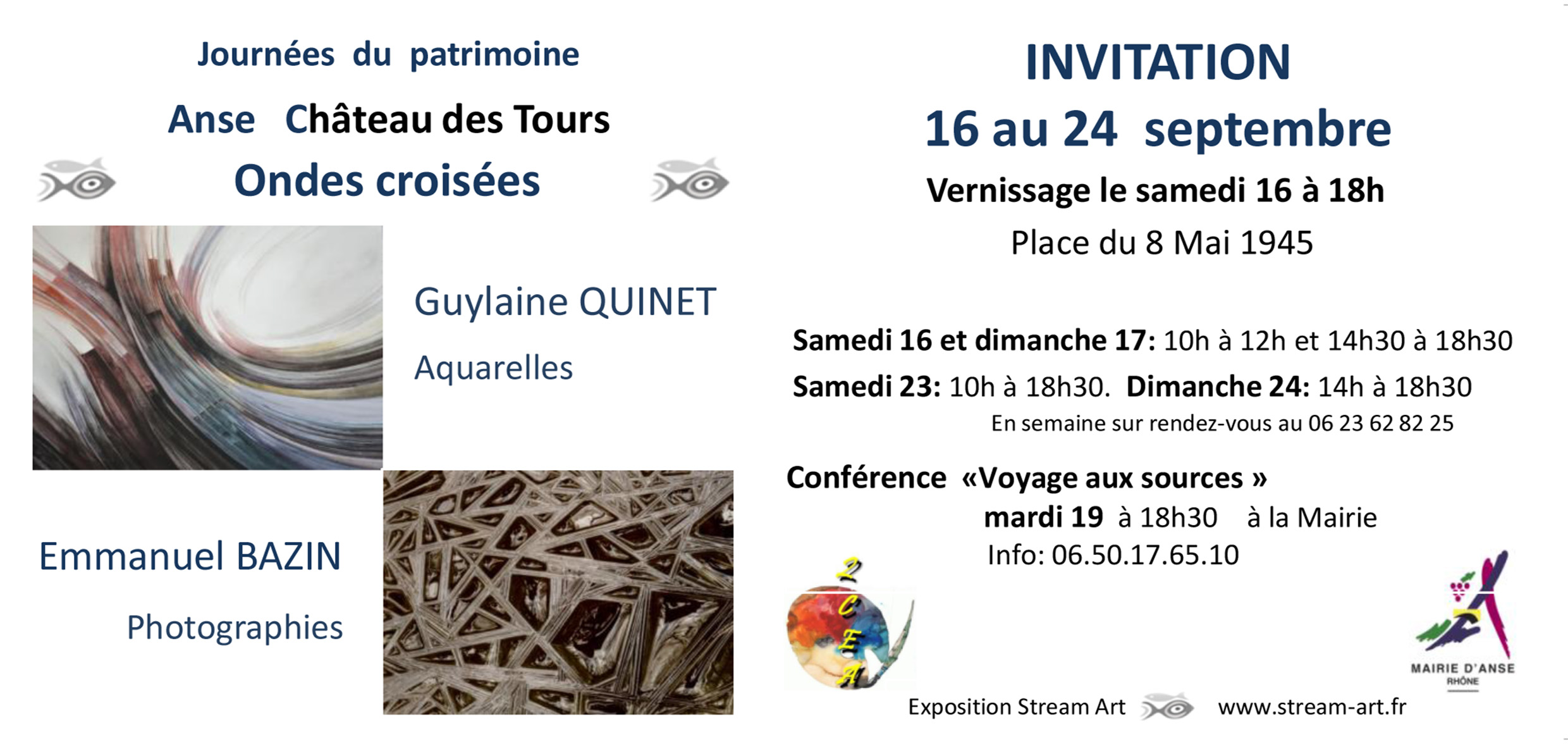 Et aussi la conférence Voyage d’eau aux sources de l’art le mardi 19 septembre à la mairie. par Thomas Mathia, scientifique et Emmanuel Bazin.