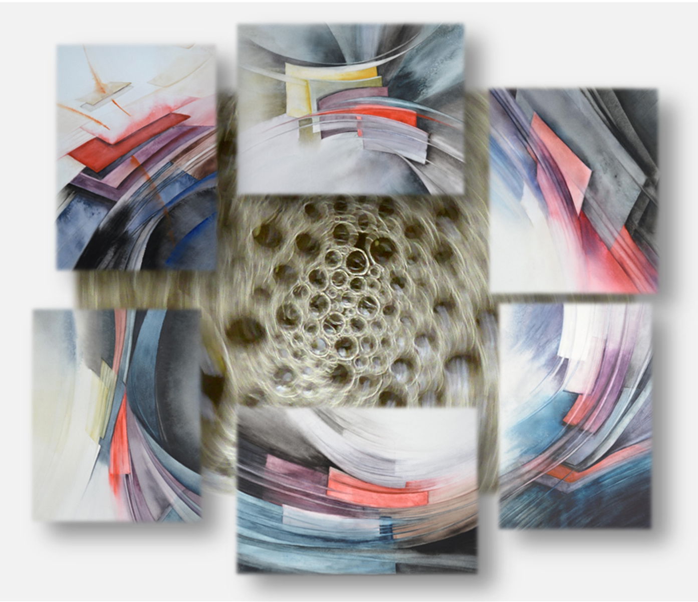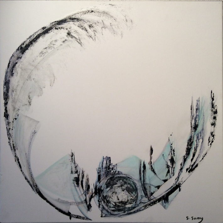Aquarelles et photos dansent la ronde; elles évoquent l’énergie créatrice à l’œuvre dans le cosmos où tout tourne comme un manège perpétuel.